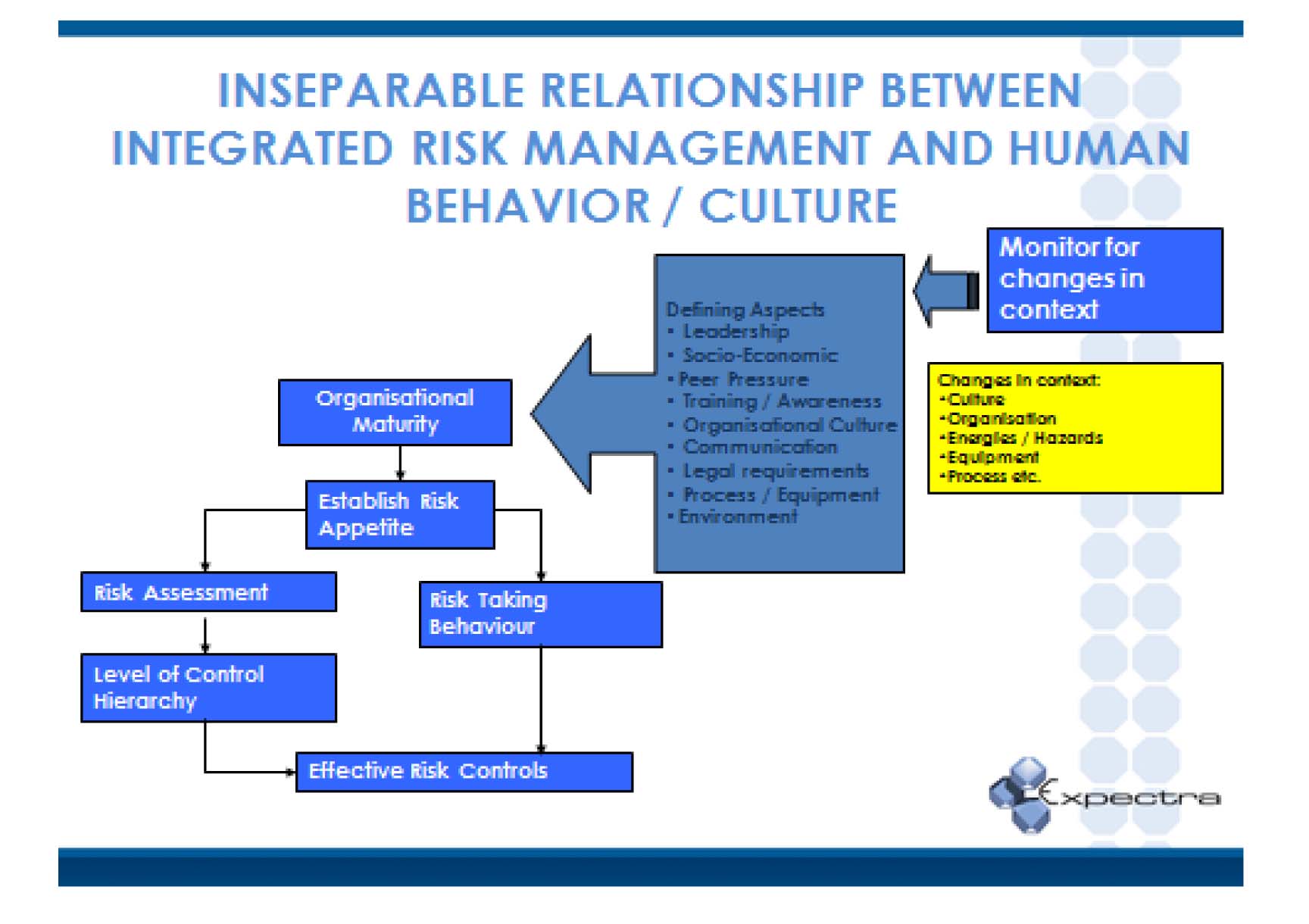 Integrated Technical Risk Management is part of Operational Risk Management in the Expectra OBM™ model and should not be viewed as a separate process, nor as a loose standing initiative that do not relate to the other activities of the organisation. The relationship between Technical Risk Management and Human Risk Management as two parts of Organisational Risk Management is illustrated in the diagram below.